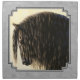 Black Friesian horse with a long wavy mane showing warm yellow highlights from late afternoon sunlight, all on a silvery grey pattern background.
