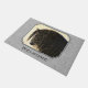Black Friesian horse with a long wavy mane showing warm yellow highlights from late afternoon sunlight, all on a silvery grey pattern background.