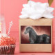 This piece of art features a black Friesian stallion horse with a luxurious long and wavy mane. Surrounded with a smoky background in shades of red and brown.