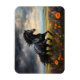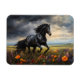 A striking black Friesian horse galloping amidst vibrant wildflowers, with a dramatic stormy sky backdrop adding a sense of power and elegance.