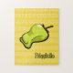 A yellow-green friggitello chili pepper, also known as a Greek golden pepper or, in the US, pepperoncini when pickled, is decorated with patterns inspired by designs on ancient Greek amphorae and sits on a yellow background with a smaller version of the same pattern and a script label in the corner. This mild pepper was originally cultivated in Italy and is eaten throughout Europe and the United States.