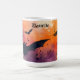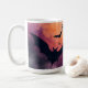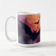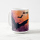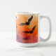 Big, spooky bats fly across a sunset-colored background on this creepy, haunted Halloween mug.