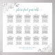 This wedding seating chart includes table assignments for 150 guests at 15 tables. The design is simple yet elegant featuring dark gray and teal or turquoise text on a white background. The title is written in lacy script calligraphy and there are silver faux foil frilly floral decorations in the corners. Stylish, chic and sophisticated way to help your guests find their seats at your reception.