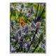 A beautiful butterfly has landed on a blue thistle flower in the midst of a summer garden.