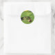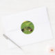This sticker features a green frog peering out at the photographer from under his lily pads. It has just stopped raining. Sun is reflected on the water droplets. The size of a few fallen leaves demonstrates just how small this little guy is.