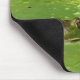 This mousepad features a green frog peering out at the photographer from under his lily pads. It has just stopped raining. Sun is reflected on the water droplets. The size of a few fallen leaves demonstrates just how small this little guy is.
