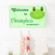 Frog kid's party supplies Cute Green Toad Froggy welcome banner. This is a funny and cute birthday party item inspired by frogs. This birthday party item is perfect for a frog theme party. Click on personalize to start customizing yours!