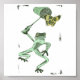 A funny illustration of a frog trying to catch a butterfly with a butterfly net. This is a vector illustration in the style of a woodcut or linocut print.