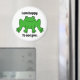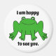 Picture a white, round magnet with a playful green frog at its center. The frog is a lively shade of green, with smooth skin that might be accented by darker green spots or subtle shading for depth. Its large, round eyes, likely golden or brown with black pupils, give it a curious and friendly expression. The frog's body is slightly crouched, with its long hind legs tucked under, as if it's ready to leap. Its front legs rest forward, with small, delicate toes splayed out, maybe even showing tiny suction pads. The frog’s mouth is a simple, thin line, possibly curved into a slight smile, giving it a cheerful appearance. The contrast between the frog's bright green body and the clean white background of the magnet creates a fun and lively design that feels full of personality.