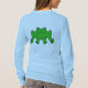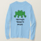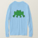 Imagine a light blue, long-sleeved tee-shirt with a vibrant green frog design on the front. The frog is a rich, leafy green, with dark spots on its back for texture. Its large, expressive eyes give it a friendly, cartoonish look, making it seem playful. The frog is sitting, with its legs slightly spread, as if ready to leap. The design pops against the soft blue background of the tee, creating a whimsical, fun vibe, perfect for casual wear.