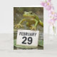 A frog leaps over a calendar page marked February 29, with sparkling water droplets and a vibrant green background symbolizing a leap year.