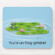 Cute green frog on a lily pad with pink water lilies and water ripples for friend or family member.