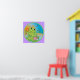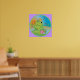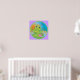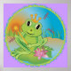 Green frog prince with crown and wand, is as happy as can be sitting on his lilypad surrounded by dragonflies. Designed in bright colors for kids or baby.