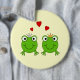 A couple of cute green frogs with red hearts. This prince frog and princess frog are on a plain light yellow cream background.