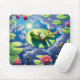 A vivid green frog is comfortably sprawled on a lily pad, soaking in the sun's rays amidst a tranquil pond dotted with pink blooming lotus flowers