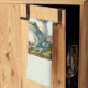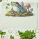 A kitchen towel with a cool illustration. Featuring a green frog sitting on a mound of grass. A big red mushroom sheltering him from the elements. A couple of little toadstools nearby.