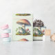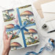 Wrapping paper with a cool illustration. Featuring a green frog sitting on a mound of grass. A big red mushroom sheltering him from the elements. A couple of little toadstools nearby.