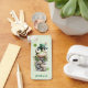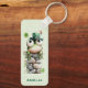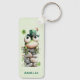 Keychain with a cute St. Patrick's Day image. A green frog with big cartoon eyes sitting on a stone wall. Wearing a green top hat with a shamrock and a little friend sitting on top of his hat.
