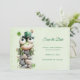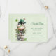 Save the date card with a cute St. Patrick's Day image. A green frog with big cartoon eyes sitting on a stone wall. Wearing a green top hat with a shamrock and a little friend sitting on top of his hat.
