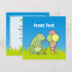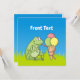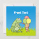 Smiling frog steals an ice-cream cone with his tongue over green grass under blue sky.