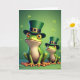 The front design shows two friendly, human-like frogs in green top hats, standing close like they’re sharing a quiet moment together 💚. The larger frog sits in the foreground with a soft upward gaze, while the smaller frog peeks from behind, echoing the pose as if following its lead. Their bodies shift from bright lime to deeper emerald, and the background fades into a misty green that makes the pair feel tucked into a cozy little scene. Tiny shamrocks drift around them ☘️, adding a festive St. Patrick’s Day touch without crowding the characters. Gentle, diffused light brings out a smooth, porcelain-like finish on their skin and a subtle shine on the hats. Each hat has a dark band and a polished gold buckle that catches the light, and both frogs have plump cheeks with a blush tint that makes their closeness feel affectionate. Near the top, a short St. Patrick’s Day greeting sits in light gold lettering against the deeper green sky, and their orange eyes and splayed orange feet pop warmly against the cool greens. Share St. Patrick’s Day sentiments with someone special.