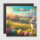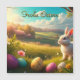 In einem idyllischen, sonnenbeschienenen Tal erstreckt sich eine malerische Frühlingslandschaft mit sanften Hügeln und blühenden Bäumen. Ein strahlend weißer Osterhase sitzt aufmerksam im Gras, umgeben von bunten, kunstvoll verzierten Ostereiern. Die Blumen in lebhaften Farben und das warme goldene Licht der untergehenden Sonne verleihen der Szene eine friedliche und festliche Atmosphäre. Über der Szenerie schwebt die elegante Schrift „Happy Easter“, die die festliche Stimmung unterstreicht.