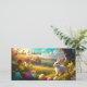 In einem idyllischen, sonnenbeschienenen Tal erstreckt sich eine malerische Frühlingslandschaft mit sanften Hügeln und blühenden Bäumen. Ein strahlend weißer Osterhase sitzt aufmerksam im Gras, umgeben von bunten, kunstvoll verzierten Ostereiern. Die Blumen in lebhaften Farben und das warme goldene Licht der untergehenden Sonne verleihen der Szene eine friedliche und festliche Atmosphäre. Über der Szenerie schwebt die elegante Schrift „Happy Easter“, die die festliche Stimmung unterstreicht.