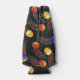 Frolf - Flaming Disc Golf bottle cooler. A cooler with background of chains with flying flaming disks in red, blue and yellow colors. Great gift for someone that is a Frolf fan.