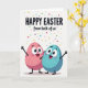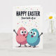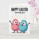 This card shows two rounded, egg-like characters near the bottom of the design, standing close as if sharing a private joke 🐰. The left figure is a soft blush pink, leaning toward a calm teal companion, and their open mouths and rosy cheeks make their bond feel sweet and friendly. Both have big, wide eyes and simple arms stretched outward, as though they’re reaching toward each other and the viewer at the same time. Across the upper area, dark lettering delivers an Easter greeting, with the smaller phrase “from both of us” placed beneath it to underline togetherness. The text sits centered and stands out strongly against the warm white background. Light diagonal lines add gentle texture behind everything, keeping the scene soft rather than busy 🌷. From the top edge, scattered confetti-like dots in many colors drift downward in a loose, celebratory sprinkle.