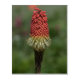 The image features a close-up, vertical composition of a single Red Hot Poker flower (Kniphofia) against a softly blurred green background. The flower head is the dominant element, positioned slightly off-center to the right. It displays a vibrant gradient of colors, transitioning from a rich, fiery red at the very top to a paler, creamy yellow towards the middle, and finally to a darker, almost black, dried section at the bottom. The flower is densely packed with individual tubular florets at the top, gradually opening up into more spiky, elongated stamens in the yellow section. The dried, dark portion at the base of the flower head consists of withered florets and a sturdy, dark stem. The background is a soft, out-of-focus wash of greens, with hints of pinkish-red in the upper left corner, suggesting other flowers or foliage in the distance. The lighting highlights the textures of the flower, with individual florets clearly defined and the fine filaments of the stamens appearing delicate. The overall impression is one of striking natural beauty, with the vibrant colors of the flower standing out against the muted, natural backdrop. The composition draws the viewer's eye directly to the intricate details and colors of the Red Hot Poker.