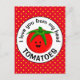 Cute round bright red tomato with five green leaves for hair ans a happy smiling face. Above and below the tomato is a funny pun in black text reading "I love you from my head tomatoes". The background is red with a retro pattern of yellow polka dots.