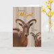 Humorous and fun birthday card from one old goat to another. Silhouette of two mountain goats with large horns looking directly into the camera on a background of vertical stripes in different shades of gray. Thick cartoon script font in orange and yellow with black and white outlines speak directly to the recipient from these silly farm animals.