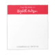 This from the desk of notepad has white display text at the top. The top portion is bright red. There are two lines of white display text in the red area. The top line says 'From The Desk Of'. The second line is for the recipient's name. The name appears as an elegant script that looks like a signature. At the bottom, there's black display text for contact information such as an email address and phone number.