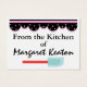 Using business cards (some regular and some chubby), I am designing cards I've always enjoyed having on hand: 1. Gift Enclosure Cards to tuck into presents or gift baskets, and 2."FROM THE KITCHEN OF" cards to do the same when you give someone something special from your kitchen. They're both a touch of class, and I've always had nice comments on the cards from my recipients. Prior to Zazzle, I used to order them from a very expensive company. I even emboss a seal with my monogram to go on the tissue or plastic wrap. I'll be glad to tell you where I got that. The way I see it is if I'm going to give a nice gift or spend time baking, it's worth it to wrap it up with a special finishing touch, so ... have fun with it ! Check the different paper stocks for your preference and price! Thanks, Sharon Rhea Ford (www.zazzle.com/sharonrhea*)