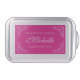 From the kitchen of personalized baking cake pan. Elegant swirly corner design with personalized name or family surname. Custom color background with stylish script typography template. Add your own pretty name, quote or monogram name initials. Cute gift idea for mom, mother, sister, friend, aunt, daughter, grandma etc. Made with love kitchen accessories and cooking supplies. Neon pink with classy ornate flourish border. Handy for cupcakes, cookies, Birthday cakes, Christmas treats, Holiday sweets etc.