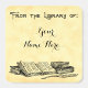 This custom square bookplate has room for your name in script letters and art of vintage books and an old feather writing quill in antique etched art on an optionalz faux parchment background, The top reads From the Library of in old English gothic letters, or customize this sticker to change fonts, even save your design for later.