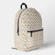 Front and back view of a backpack with a playful red and green parrot pattern on a beige background. The back is solid black with padded straps.