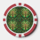 Front and back view of a poker chip with red edges and intricate green tree design at the center, conveying a sense of nature and symmetry.