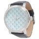 Front and back views of a wristwatch. The face has a blue floral pattern with black hands, and a black leather strap. The back has engraved details.