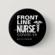 This design was created for the brave heroes working with the coronavirus pandemic patients. The black and white button pin has "Frontline Nurse" in bold white distressed block lettering typography and "Covid 19" with a large white medical caduceus. Personalized with nurse's name. Click the personalize template option and enter name.