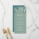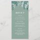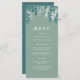 This dinner menu features an illustration of snowy foliage in a green and white colour palette including berries, eucalyptus, fir branches and leaves. This would be perfect for an elegant festive event or for a dinner menu at a winter wedding.