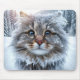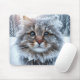 A fluffy Maine Coon cat with wide eyes and its face covered with frozen snow set against a backdrop of tall, snow-laden pine trees