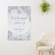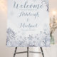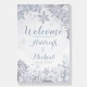 This personalized winter wonderland wedding welcome sign has silvery-blue snowflakes, icy frost, and snow-covered tree branches on it for a winter wedding or bridal shower. Personalize it with your names and wedding date