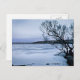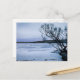 This postcard is a scenic winter landscape of an impressionistic depiction of frozen Cayuga Lake viewed from Stewart Park in Ithaca, NY. It is one of the five Finger Lakes in upstate New York. The frigid icy cold day in February is illustrated by the lovely shades of blue, gray, black and white of the ice and sky. A willow tree in silhouette frames the foreground.