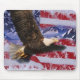 A beautifully patriotic image of an American Bald Eagle bird soaring over snow covered mountains, on a waving American Flag bordered with frozen snow and ice. The frozen flag photo was taken by the observant sharp-eyed photographer, Rob Boyer.