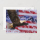 A beautifully patriotic image of an American Bald Eagle bird soaring over snow covered mountains, on a waving American Flag bordered with frozen snow and ice. The frozen flag photo was taken by the observant sharp-eyed photographer, Rob Boyer.