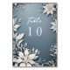 Magical winter wedding table numbers, featuring an icy blue background with crisp winter flowers and foliage.