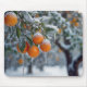 Oranges hang on a branch covered in snow, each fruit adorned with icicles glistening in the winter light
