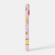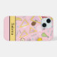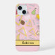 Personalize this iPhone case printed with a colorful abstract fruit and memphis style pattern on pink and yellow. Just edit the name text. Choose from two styles for Apple iPhone 15 or a variety of other phone models in the drop-down menu.