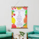 A hanging tapestry featuring a Bible scripture from the book of Galatians 5:22-23 and decorated with watercolor illustrations of a variety of colorful fruits painted with watercolor and accented with spatter spots.
